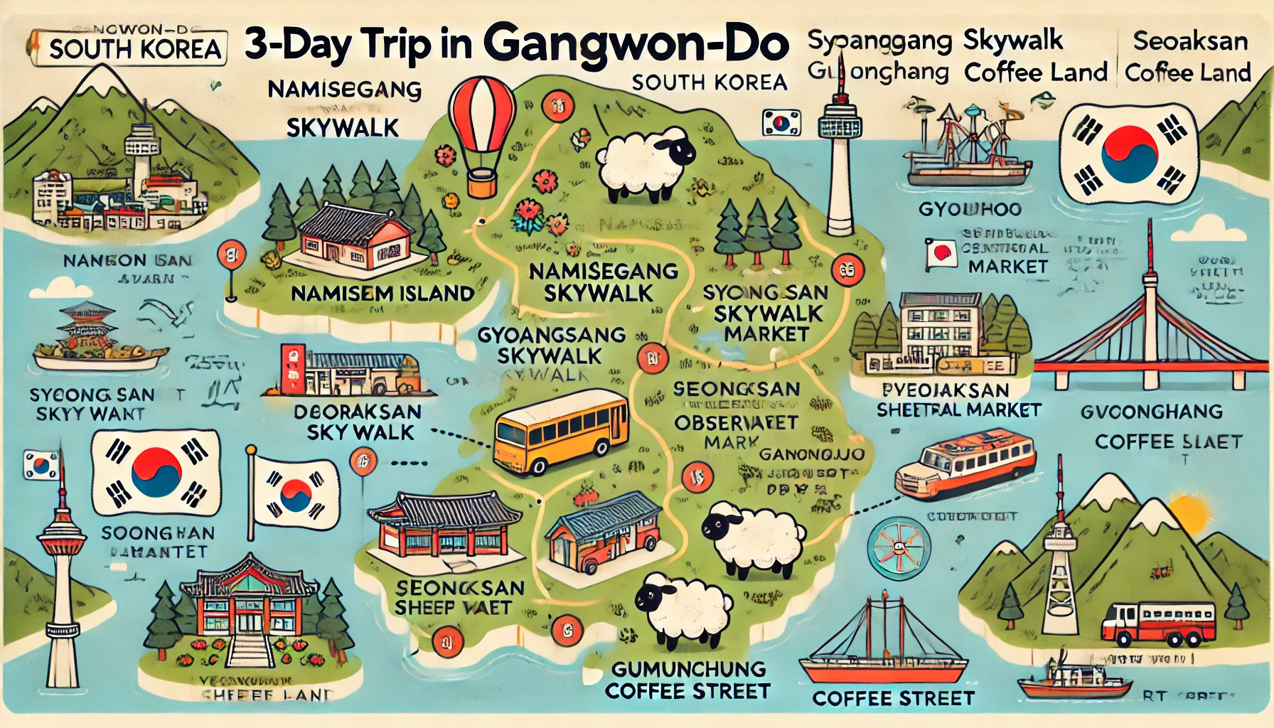 - 여행 팁: 여행 전 날씨를 확인하고, 편안한 신발과 옷을 준비하세요. 각 관광지의 운영 시간과 입장료도 미리 확인하는 것이 좋습니다. 또한, 여행 일정에 맞춰 충분한 휴식을 취하며 여행을 즐기는 것이 중요합니다.